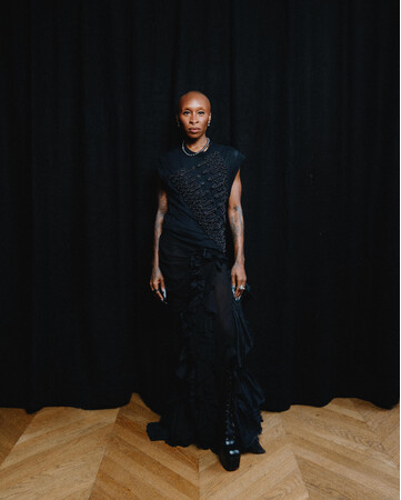 Alexander McQueen11月8日、パリのパレ・ガルニエにて開催された『ウィキッド』スクリーニングでは、2026年春夏コレクションより、フロッギング刺繍を施したブラックのコットンジャー...