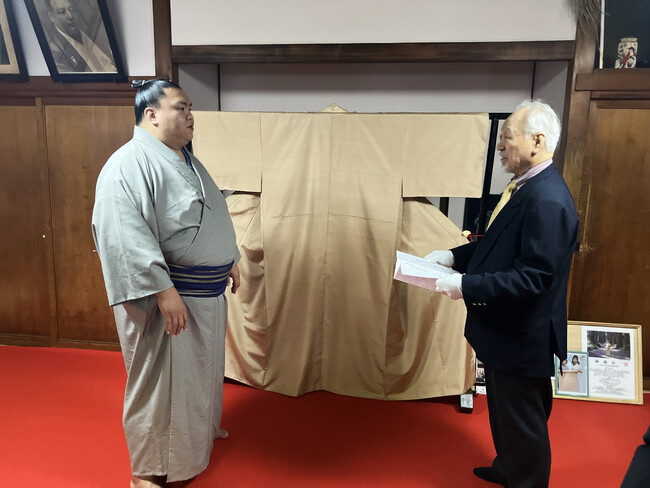 株式会社たちばな染色作家・林部貢一氏と株式会社たちばなが協働御嶽海への着物贈呈の目録を読み上げる林部氏。株式会社たちばな(本社:長野県長野市、代表取締役:松本亮治)は、長野市の染色作家・林部貢一...