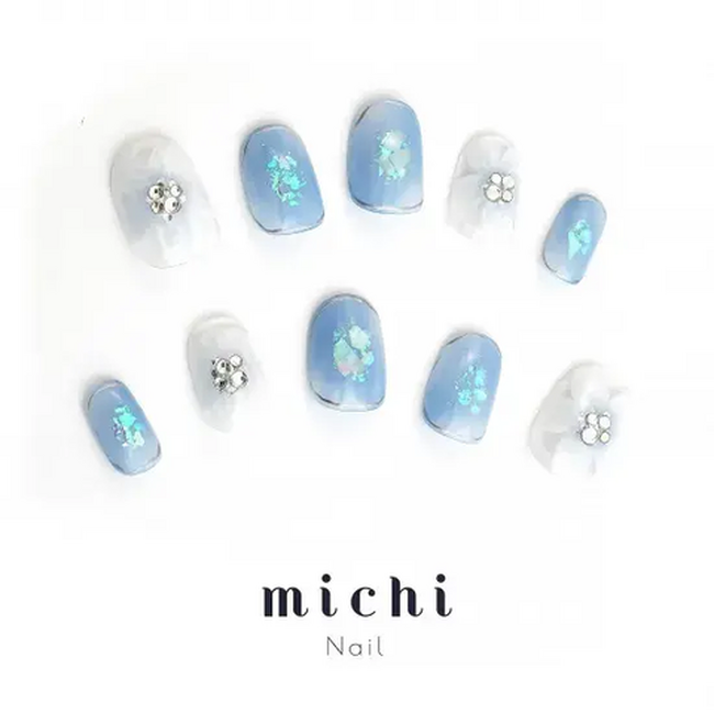 丸井織物株式会社ニュアンスブルーとフラワーネイルhttps://jp.michimall.com/?pid=1879292912,350円(税込)明るすぎないニュアンスブルーと、クリアベースのフ...