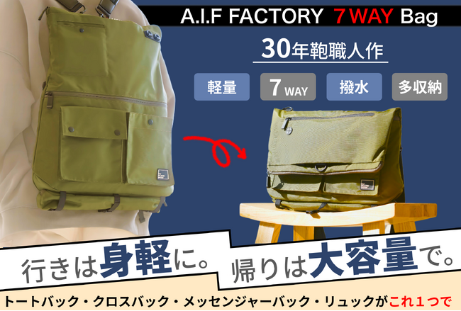 Won. Studio Japanトート・リュック・クロス・メッセンジャーバック、計7つの演出!11個のポケットで収納性を兼ね備えたスマートバック「A.I.F FACTORY 7WAY Bag」...