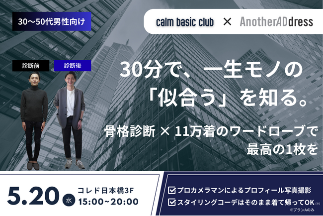 株式会社ファイブミーターズ「何を着ればいいかわからない」悩みをプロが論理的に解決。大人メンズの部活動「calm basic club」×「AnotherADdress」が、プロの骨格診断とスタイ...