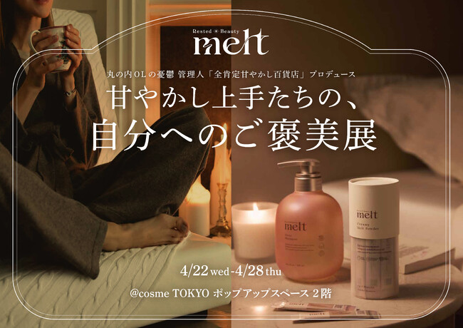 花王melt PR事務局4月22日(水)より@cosme TOKYOで期間限定開催 “3つの休息時間”をテーマ、とろけるような夜の過ごし方を提案 花王株式会社のヘアケアブランド「melt(メルト...