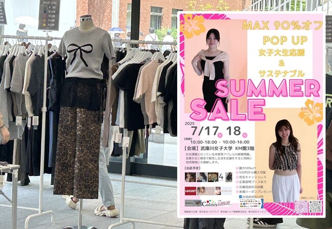 株式会社ディープサンクス経営学部の学生とともに衣料品廃棄問題と大学生の生活応援を持続可能な三方よしの仕組みで解決武庫川女子大学の学内で掲出されたポスターと販売ブースのイメージ(他大学で実施した際...