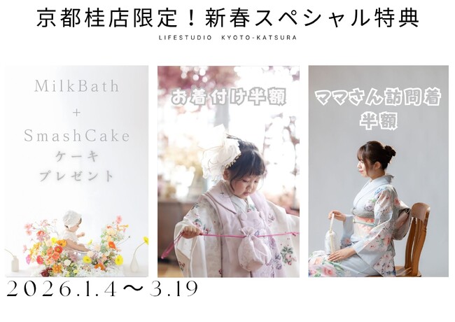 株式会社アップルツリーファクトリー京都市・西京区のライフスタジオ京都桂店では、2026年1月4日~3月19日の期間限定で、「ミルクバス撮影」「七五三後撮り」「ママの訪問着お支度」を対象にした豪華...