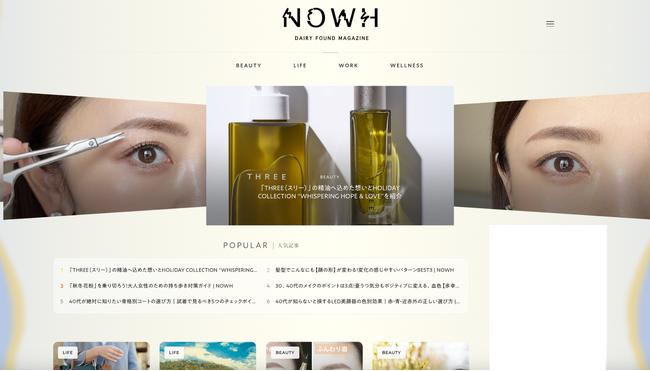CLYR株式会社30~40代の“ゆらぎ世代”女性向けメディアNOWH(ナウ)は、THREE公式タイアップ特集を掲載中。世界観を紐解く内容が好評で、読者プレゼントも明後日まで受付中。ゆらぎ世代の女...
