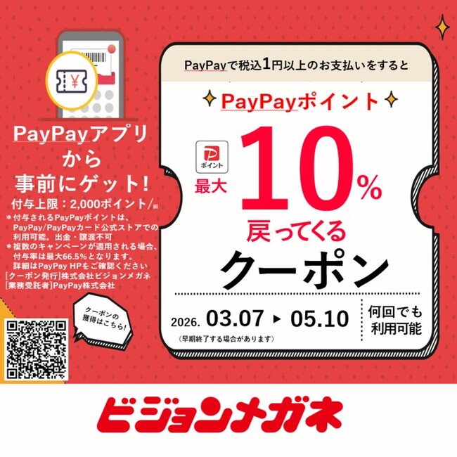 株式会社ビジョンメガネ眼鏡専門店を運営する株式会社ビジョンメガネ(大阪市)は、スマートフォン決済サービス「PayPay」の利用で、最大10%のPayPayポイントを付与するキャンペーンをビジョン...